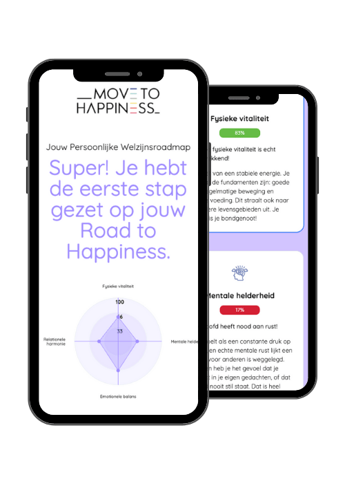 Jouw welzijn is de basis voor alles: energie, focus en levenskwaliteit. De Move To Happiness welzijnsassessment helpt je 4 essentiële levensdomeinen in kaart te brengen. In minder dan 5 minuten ontdek je jouw sterke punten en de gebieden die de meeste aandacht verdienen, zodat je proactieve stappen kunt zetten op jouw eigen Road to Happiness.